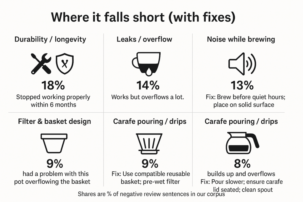 - Leaks / overflow — 3 positive vs 11 negative mentions (14 total). Overflow tends to occur if the basket isn’t seated or filters collapse; a few bottom‑leak failures reported.