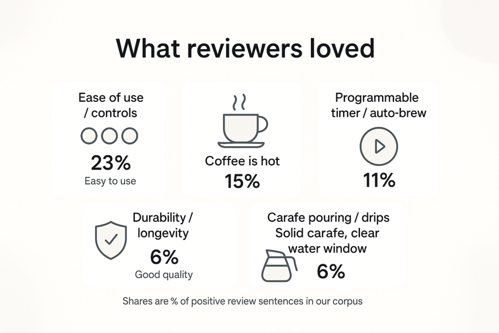 - Carafe pouring / drips (6% of positive mentions): “Carafe feels solid, I like where the view window is for the reservoir.”