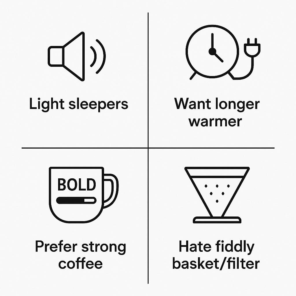 - Light sleepers or open-kitchen households sensitive to brew noise
